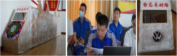 西柏坡精神是部生動(dòng)的教科書,車間工人黨員袁有德利用平時(shí)裝配件的紙盒子,創(chuàng)意性地制做了一列"團(tuán)結(jié)奮進(jìn)號(hào)"火車,邀請(qǐng)黨員一起乘車前行。袁有德說:"團(tuán)結(jié)奮進(jìn)號(hào)"列車蘊(yùn)含著學(xué)習(xí)西柏坡精神,強(qiáng)企富家、團(tuán)結(jié)奮進(jìn)的寓意,車頭前面的"大眾"標(biāo)識(shí)代表公司經(jīng)營(yíng)的品牌;八個(gè)綠色的大美孚機(jī)油蓋代表八方來財(cái),所有蓋口都向外代表招攬客戶,減少流失,而且像螺絲釘一樣牢牢釘?。≤囶^車尾標(biāo)有"勿忘來時(shí)路"的字樣,以此提醒廣大黨員干部不忘初心、牢記使命,一定不要忘記來時(shí)的路,回顧過去,展望未來,讓"團(tuán)結(jié)奮進(jìn)"號(hào)列車在西柏坡精神的感召下前行。支部要求,在疫情防控和汽車行車嚴(yán)竣的形勢(shì)下,我們每一個(gè)物產(chǎn)汽貿(mào)員工都是新時(shí)代的答卷者,讓"團(tuán)結(jié)奮進(jìn)號(hào)"奔馳在新時(shí)代的征程上,承載著中國(guó)夢(mèng)、物產(chǎn)夢(mèng),承載著物產(chǎn)汽貿(mào)職工群眾對(duì)美好生活的向往,風(fēng)馳電掣,勇往直前,奔向未來!