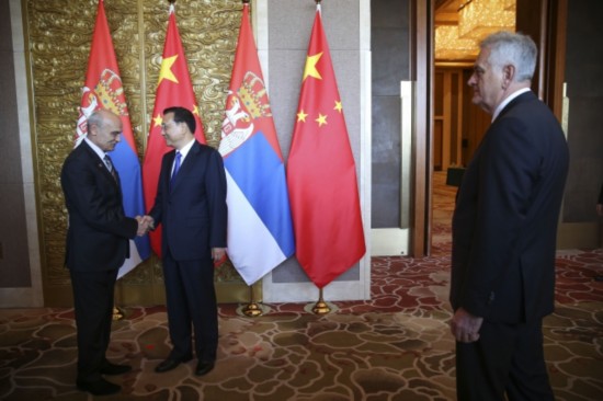 李克強(qiáng)總理與塞爾維亞代表團(tuán)成員握手,